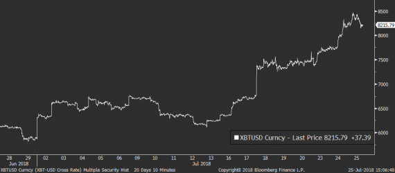 Třídou aktiv, která v posledních dnech rozhodně nestagnuje pak dál zůstává hlavně krypto v čele s Bitcoinem. Ten se dnes nad ránem vyhoupl až nad hranici 8 300 dolarů a i když část svých zisků momentálně odevzdává, svůj silný růstový trend zatím drží. Důvody náhlého růstu BTC jsou malou záhadou, jelikož se fundamentálně situace nijak výrazně nemění. Zjevně mu ale pomohla likvidace velkých short pozic na několika kryptoburzách z minulého týdne, která indikuje, že někteří z velkých hráčů krypto přestali (alespoň prozatím) prodávat a která nastartovala aktuální růstový trend.