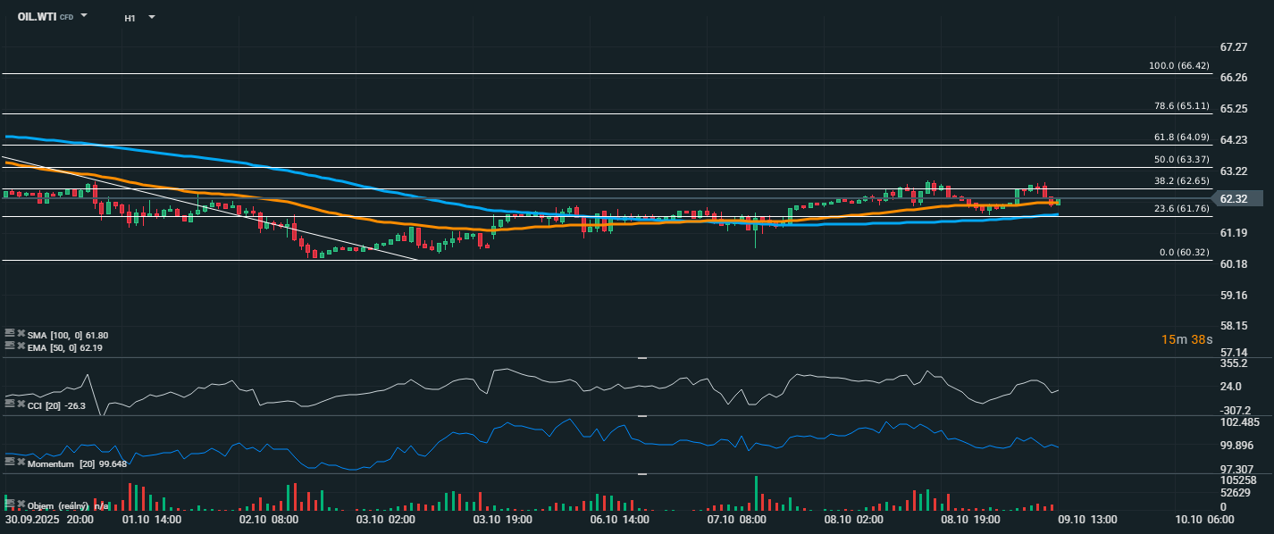 Cena OIL.WTI se aktuálně obchoduje kolem 62,32 USD, tedy nad klíčovou zónou 23,6 % Fibonacciho retracementu (61,76 USD), která slouží jako krátkodobá technická podpora. Cena se zároveň nachází těsně nad klouzavými průměry EMA 50 (62,19 USD) a SMA 100 (61,80 USD), což potvrzuje krátkodobý rostoucí trend, přestože došlo k mírnému pullbacku po předchozím růstu. CCI se aktuálně nachází na úrovni -26,3, což značí ochlazení nákupního momenta, ale ještě ne zónu přeprodanosti. Momentum je stále nad úrovní 99, což naznačuje, že býčí síla zatím úplně nezmizela, ale zpomalila.