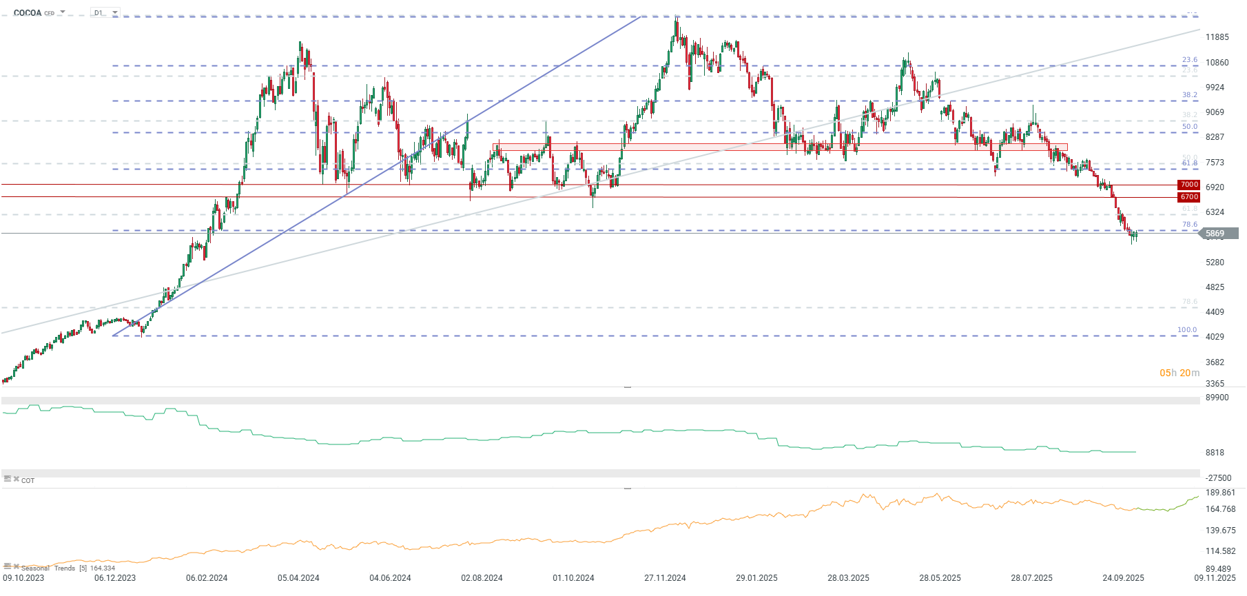 Ceny kakaa se drží kolem 5 800 USD za tunu a již třetí seanci v řadě vykazují pozoruhodnou odolnost. Dnes je to obzvlášť zřetelné, přestože byly zveřejněny mimořádně negativní údaje o zpracování z Malajsie a Brazílie. Slabá čísla se očekávají také z Evropy a Asie. Klíčová otázka tedy zní: dosáhl trh svého dna, nebo přijde další vlna poklesu?