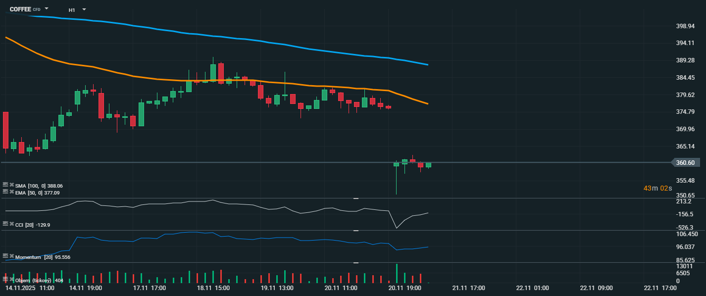 Na grafu kávy (CFD) je zřetelný prudký výprodej, který následoval po oznámení zrušení cel na brazilskou kávu ze strany USA. Cena spadla až k hladině 352,5 USD, než došlo k částečnému odrazu a stabilizaci kolem 360,60 USD. Tento pokles následoval po delším období konsolidace těsně pod klouzavým průměrem EMA 50 (377,09 USD) a výrazně níže pod SMA 100 (388,06 USD). CCI se propadl hluboko do přeprodaného pásma (-129,9), což potvrzuje silný výprodejový tlak a potenciál pro technický odraz. Momentum je těsně pod nulou, ale začíná mírně růst, což značí první známky stabilizace po propadu. Objemy během poklesu výrazně vzrostly, což indikuje panické výprodeje a silnou reakci trhu na fundamentální zprávu. Přestože došlo ke krátkodobému oživení, cena zůstává hluboko pod klíčovými průměry, což omezuje růstový potenciál.