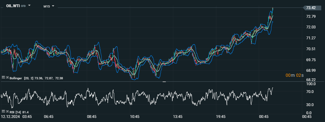 Tento graf znázorňuje dynamiku cen ropy WTI s využitím Bollingerových pásem (20, 2) a RSI (14). Průlom Bollingerových pásem nahoru a RSI nad 70 signalizují silný nákupní tlak a rostoucí poptávku. Zdroj: xStation5