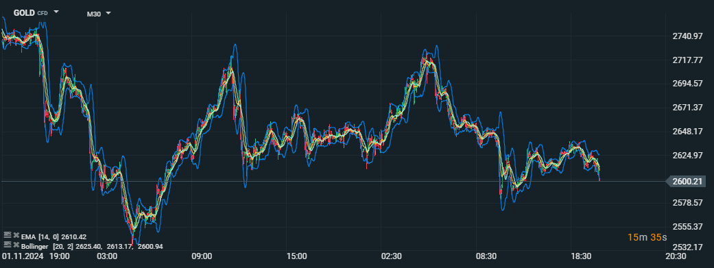 Ceny zlata klesají na 2 600,21 USD za trojskou unci; Bollingerova pásma ukazují na vysokou volatilitu, zatímco EMA (14) potvrzuje klesající trend. Zdroj: xStation5
