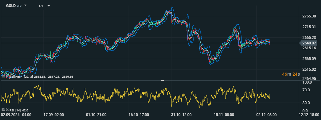 Analýza cen zlata s použitím Bollingerových pásem (20,2) a RSI na H1 grafu – Graf ukazuje nedávnou konsolidaci kolem 2 640 USD, přičemž RSI naznačuje neutrální momentum a Bollingerova pásma ukazují možnost průlomu. Zdroj: xStation5