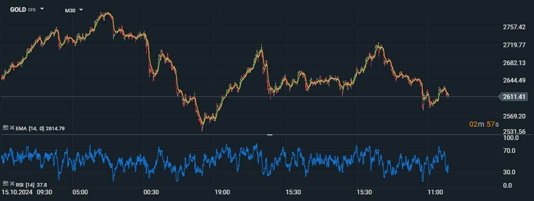 Ceny zlata oscilují kolem 2 611,41 USD; EMA (14) naznačuje klesající trend, zatímco RSI na úrovni 37,8 poukazuje na přeprodaný stav trhu. Zdroj: xStation5