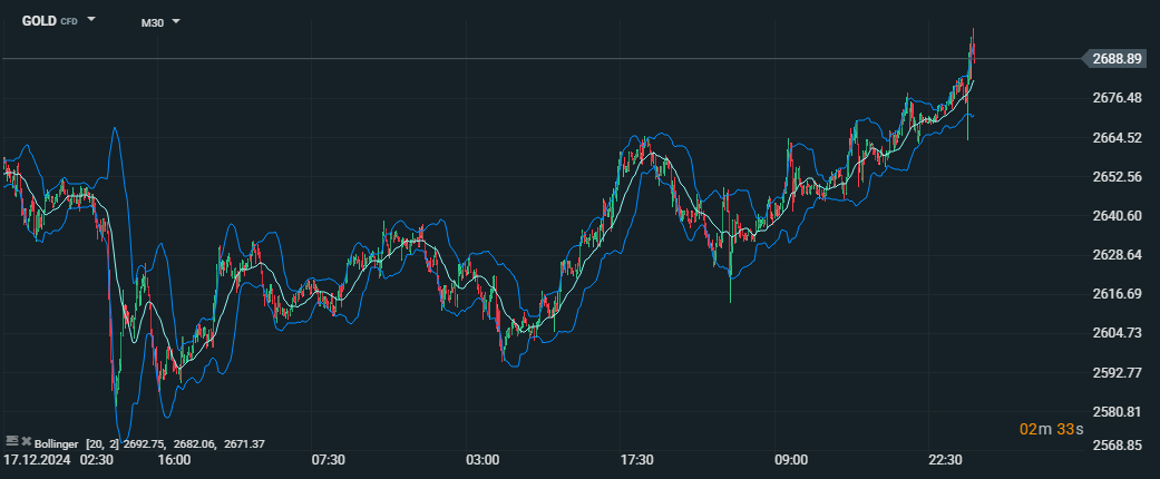 Graf znázorňuje pohyb ceny zlata na 30minutovém intervalu s použitím Bollingerových pásem (20, 2). Cena zlata během seance rostla, přičemž se držela nad středovou linií pásma, což signalizuje pozitivní trend. Klíčová podpora se nachází na úrovni 2 667 USD, zatímco rezistence byla překonána na 2 688 USD, což posiluje býčí momentum. RSI naznačuje krátkodobé překoupení trhu, ale sentiment zůstává pozitivní. Zdroj: xStation5