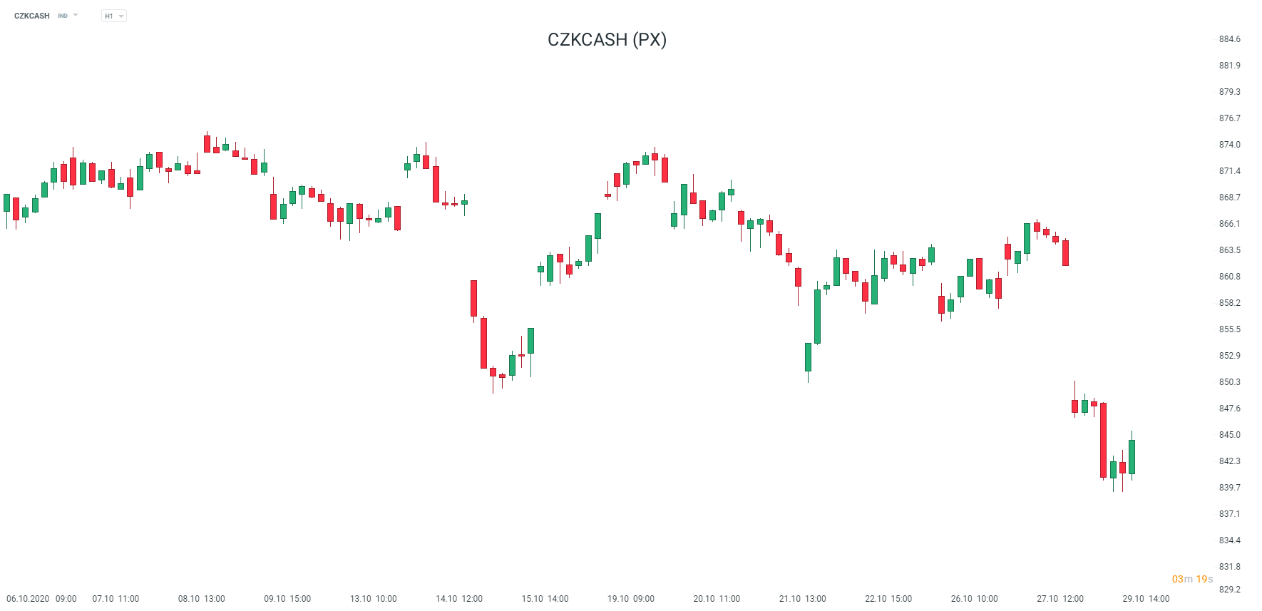 Akciové indexy v průběhu čtvrteční seance ztrácely. Strach z nárůstu počtu případů koronaviru se nevyhnul ani pražské burze. Index PX (CZKCASH) zaznamenal pokles o 1,88 % na 848,85 bodů. Nejvyšší ztráty zaznamenal bankovní sektor Erste bank (RBAG.CZ) klesla o 3,37 % na 473,50 Kč. Druhý nejvyšší pokles zaznamenala Komerční banka (KOMB.CZ) se ztrátou 3,17 % na 473,50 Kč a Moneta (MONET.CZ) ztratila 2 % na 53,80 Kč za akcii. Objem obchodů s akciemi za dnešní den je 769,9 mil. Kč.