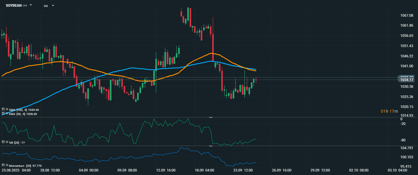 Cena sójových bobů se aktuálně obchoduje na úrovni 1034,17 USD. Klouzavé průměry ukazují na přetrvávající slabost – cena se pohybuje pod EMA 50 (1038,69 USD) i pod SMA 100 (1039,40 USD), které nyní tvoří blízkou rezistenční zónu. Jejich překonání by bylo prvním signálem posílení býků. Williams %R se nachází na hodnotě -77, tedy blízko přeprodané oblasti, což naznačuje možnost krátkodobého odrazu. Momentum (97,8) ukazuje na mírné zlepšení tempa růstu po dosažení lokálního dna.