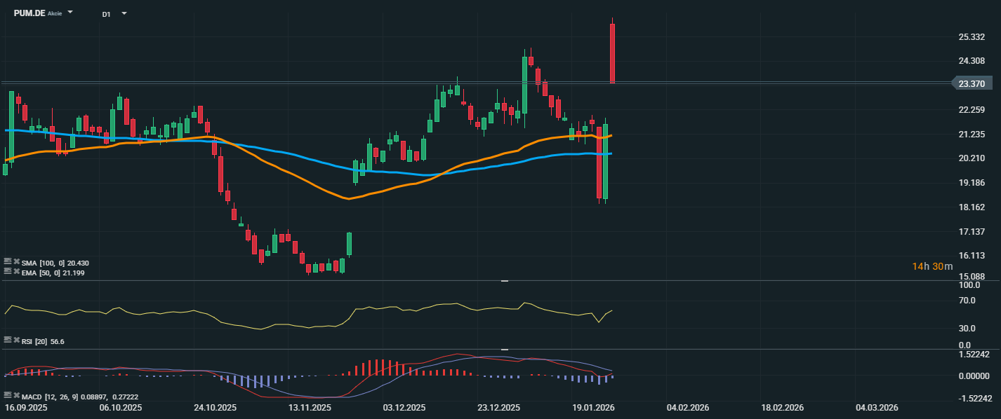 Akcie společnosti Puma dnes reagovaly na zprávu o vstupu čínské společnosti Anta Sports, která získá 29% podíl, prudkým růstem hned po otevření trhu. Cena se vyšplhala až na úroveň 26,15 EUR, což představuje skokový nárůst a reakci trhu na pozitivní zprávu o novém strategickém investorovi. Tento výrazný růst ale dlouho nevydržel a došlo k výraznému výběru zisků, a cena se stáhla zpět na aktuální úroveň 23,37 EUR. Z technického hlediska však došlo k průrazu nad důležité klouzavé průměry – EMA 50 (21,20 EUR) i SMA 100 (20,43 EUR), které nyní mohou působit jako nová podpora. RSI se posunul na 56,6 bodu, tedy do pozitivního pásma, ale stále daleko od překoupené oblasti.