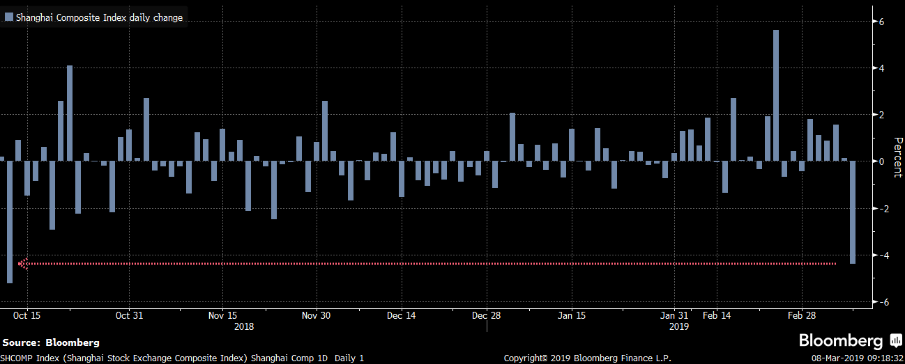 Akciový index Shanghai Composite dnes zakončil seanci s více než 4 % ztrátou. To se naposledy stalo v polovině minulého října, kdy světové burzy zahajovaly první vlnu korekce, která nakonec na řadě z nich přerostla v prosinci až v krátký medvědí trh.