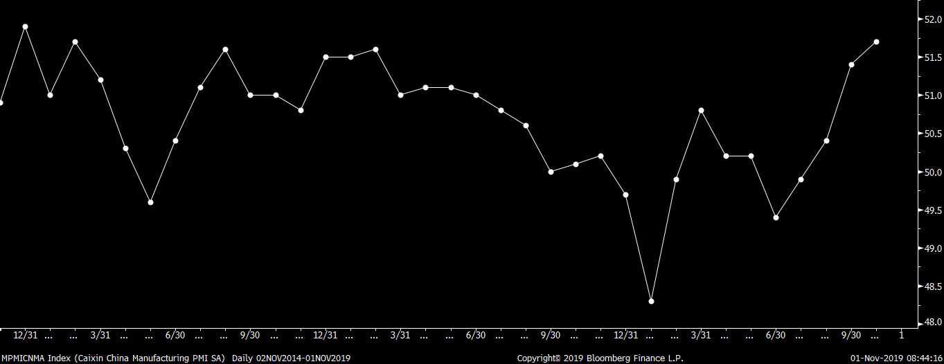 Caixin PMI roste už čtvrtým měsícem v řadě. Zdroj: Bloomberg