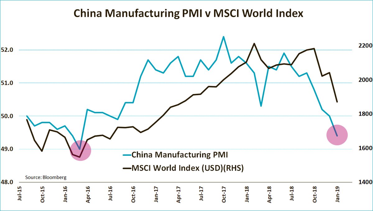 Dnes tento trend potvrdil aj index výrobnej dôvery. Ten klesol na úroveň 49,4b. (hranica medzi rastom a poklesom aktivity v sektore je 50b.). Keď bol naposledy takto nízko začiatkom roka 2016 tak vláda spustila sériu monetárnych a fiškálnych stimulov. Bude sa história opakovať?. Btw. pokiaľ by sa opakovala, tak spustenie čínskych stimulov v roku 2016 odštartovalo rast globálnych akcií.
