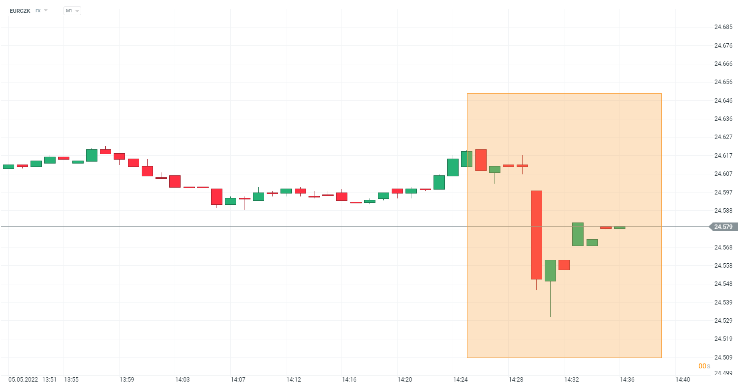 Česká koruna byla před rozhodnutím ČNB stabilní. Na páru s eurem se obchodovala v blízkosti úrovně 24,60. Po překvapivém rozhodnutí o růstu sazeb o 75 bps posílila v okamžité reakci do blízkosti úrovně 24,53. Pár USDCZK reagoval ještě výrazněji, nicméně po několika minutách se vrátil k původním úrovním do blízkosti 23,25.