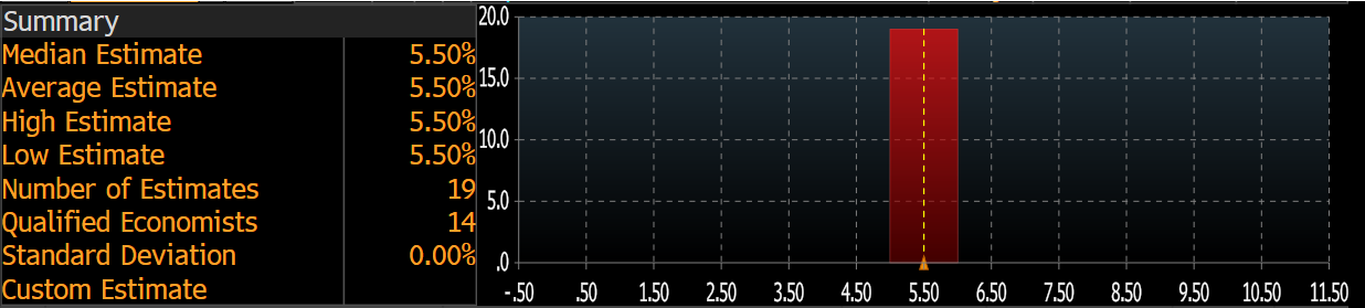 Odhady byly tentokrát jednoznačné. Všichni oslovnení analytici se shodli na růstu hlavní repo sazby o 50 bps na 5,5 %. Česká národní banka tak opět překvapila trh. Zdroj: Bloomberg