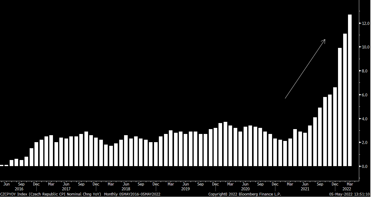 Inflace v Česku dramaticky roste. Index CPI dosáhl v březnu na 12,7 %. Zdroj: Bloomberg