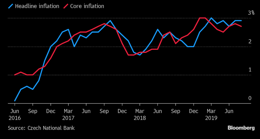 Vývoj inflace v Česku, data ČNB. Zdroj: Bloomberg