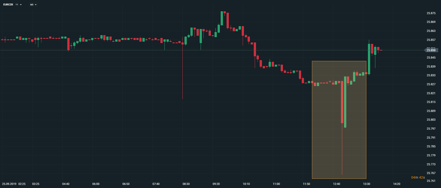 Vývoj páru EURCZK - reakce na sazby, M5. Zdroj: xStation5
