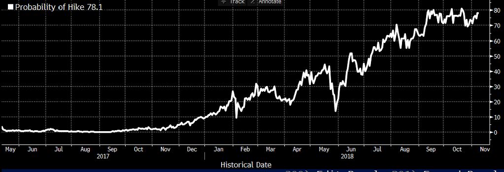 Prvá možnosť je z nášho pohľadu reálna, druhá je málo pravdepodobná. V zásade platí, že keď FED ponechá svoj komentár nezmenený, takto bude pre dolár mierne pozitívne. A to z toho dôvodu, že trhy ešte nie sú úplne presvedčené o decembrovom zvýšení úrokových sadzieb. Od začiatku septembra sa pravdepodobnosť decembrového zvýšenia sadzieb pohybuje v pásme 70-80%. Pokiaľ by FED zopakoval svoj predošlý komentár, tak sa bude ťažko hľadať akýkoľvek dôvod, aby o 6 týždňov nešlo úročenie vyššie.