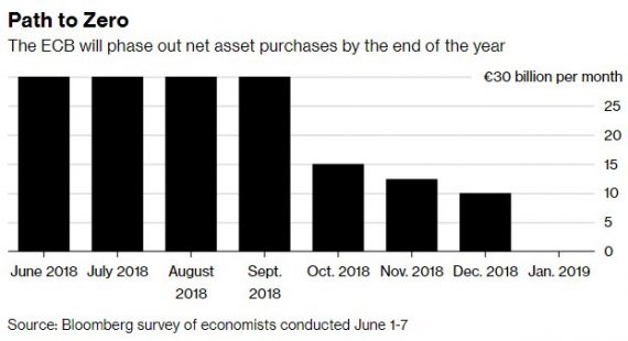 Podľa posledných vyjadrení predstaviteľov ECB to však vyzerá, že zatiaľ tieto správy nie sú natoľko vážne, aby ohrozili ukončenie QE. Očakáva sa, že Draghi na tlačovej konferencii naznačí, že na júlovom zasadnutí sa budú meniť parametre politiky. Tie by mali priniesť zníženie QE od septembra na 15 mld. eur mesačne s tým, že koncom roka sa program úplne skončí. Zároveň sa hovorí aj o tom, že v júli by mala ECB vypustiť zo svojho komentára ohľadom budúceho vývoja úrokových sadzieb frázu, že sadzby sa nebudú meniť ešte dlhú dobu po ukončení QE. To by malo pre ECB vytvoriť priestor pre ich zvýšenie niekedy v polovici budúceho roka, pokiaľ pôjde všetko dobre. Podľa trhov je pravdepodobnosť, že ECB zvýši úročenie budúci rok v júni zhruba 50%
