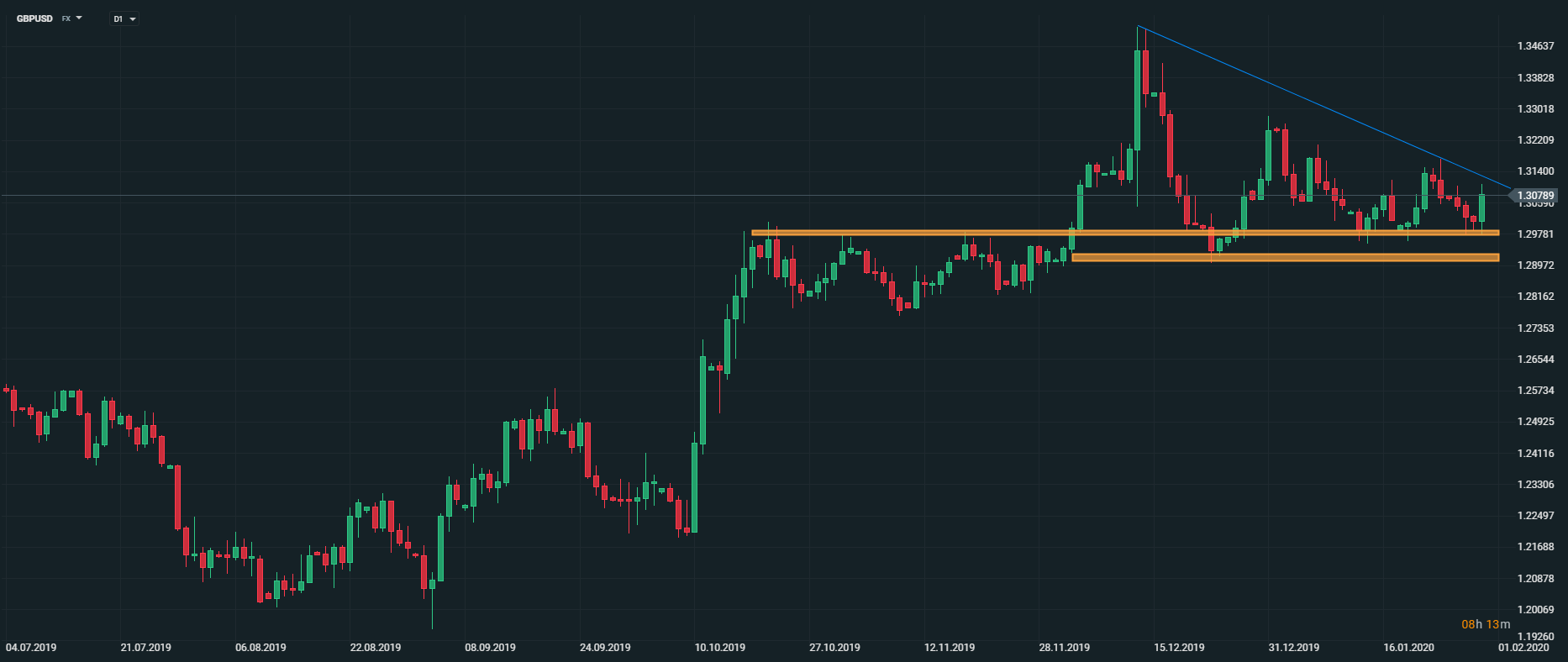 Menový pár GBPUSD sa odrazil od supportu v oblasti 1,2980 a v súčasnosti testuje hranicu 1,31. V prípade, ak sa pár dokáže dostať nad klesajúcu trendovú líniu, otvorá sa priestor pre dodatočný rast. Zdroj: xStation5