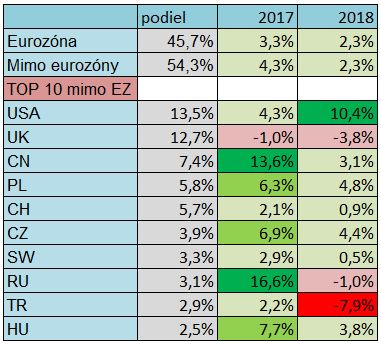 Rast exportov spomalil do všetkých hlavných exportných partnerov s výnimkou najväčšieho – USA, kde rast prudko zrýchlil z 4,3% na 10,4%. Silný ekonomický rast USA teda bol v minulom roku dôležitou hrádzou pred spomalením EÚ.