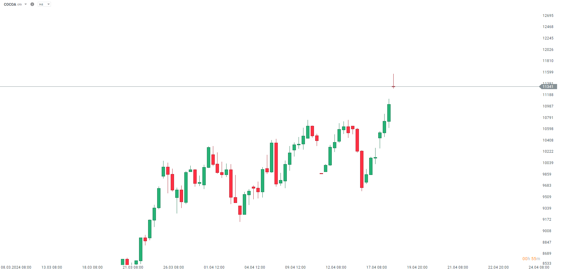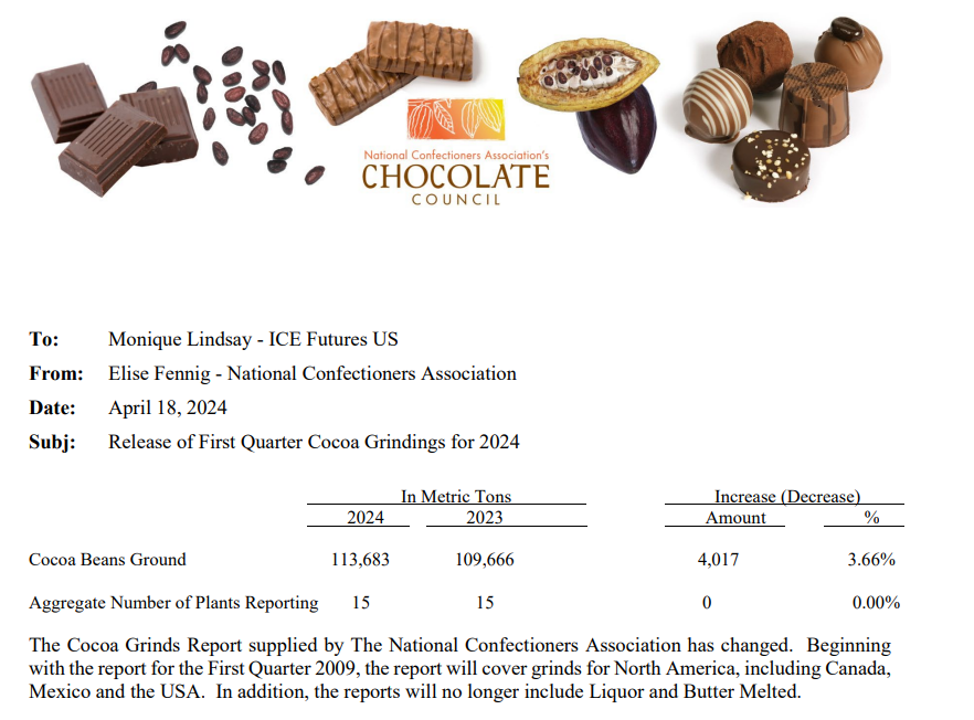 COCOA zahájilo dnešní obchodování s býčí cenovou mezerou a nyní se obchoduje o více než 5 % výše. Údaje o mletí kakaa v Severní Americe za Q1 2024 byly zveřejněny včera po uzavření futures trhu. Data ukázala, že broušení za 1. čtvrtletí v Severní Americe bylo vyšší než před rokem a vyšší než před čtvrtletím. Nutno podotknout, že broušení v roce 2023 kleslo nejvíce ve Spojených státech, proto se očekávalo, že negativní dopad zvýšení cen bude nejvíce patrný v USA.
