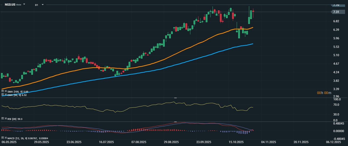 Akcie New Gold se obchodují kolem 7,31 USD, tedy výrazně nad klouzavými průměry – EMA 50 na 6,52 USD a SMA 100 na 5,69 USD. RSI se nachází na hodnotě 59,3, tedy blízko překoupené zóny, což však zatím neindikuje obrat. MACD je pozitivní a vykazuje býčí překřížení, což podporuje pokračující nákupní zájem.
