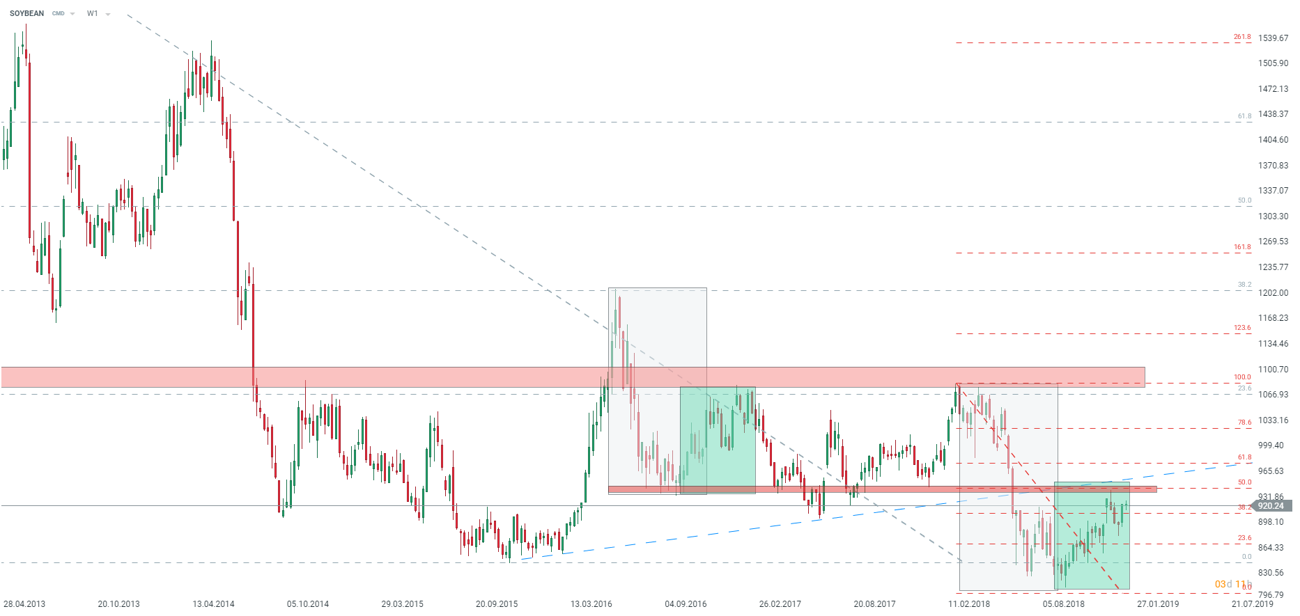 Ceny sójových bobů jsou omezené rezistencí na 950 centech. Obchodní dohoda USA s Čínou by mohla opět zvýšit čínskou poptávku. Zdroj. xStation5