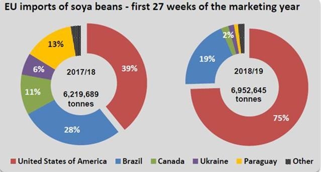 Importy sójových bovů EU v % celkových importů výrazně vzrostly ve srovnání s předchozí sezónou. Celkové EU importy také zaznamenaly výrazný nárůst. Zdroj: foodingredients.com