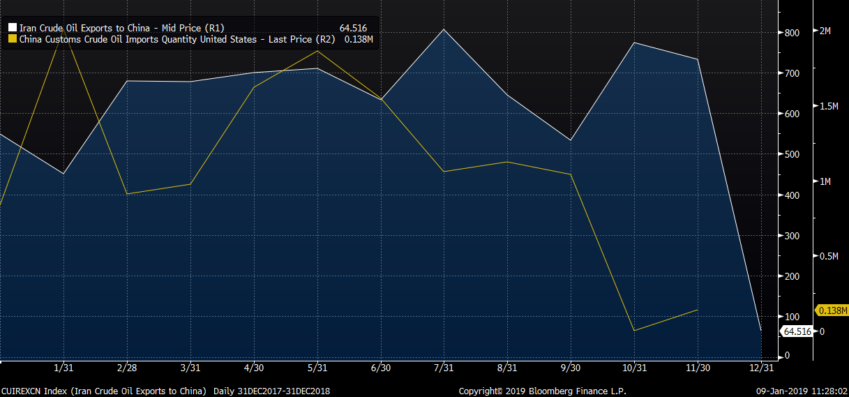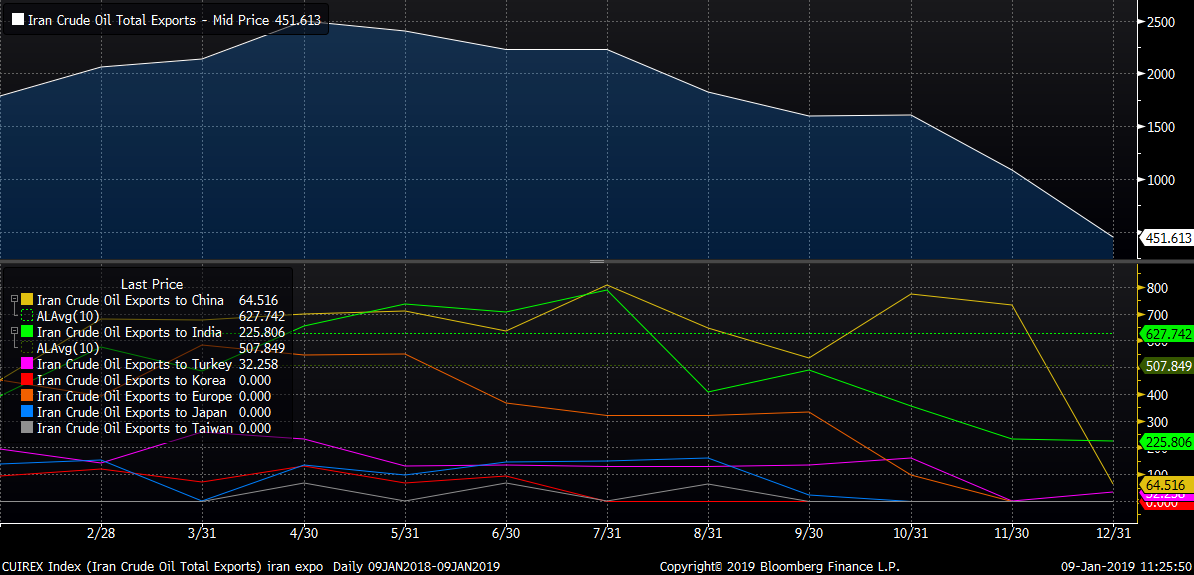 V datech íránských exportů ropy za prosinec je vidět extrémní pokles exportů do Číny (data mohou být revidována). Přestože země jako Čína, Japonsko, Indie nebo Jižní Korea nemusí dodržovat sankce USA, tak se nečeká, že by tyto země zvyšovaly importy z Íránu. Zdroj: Bloomberg