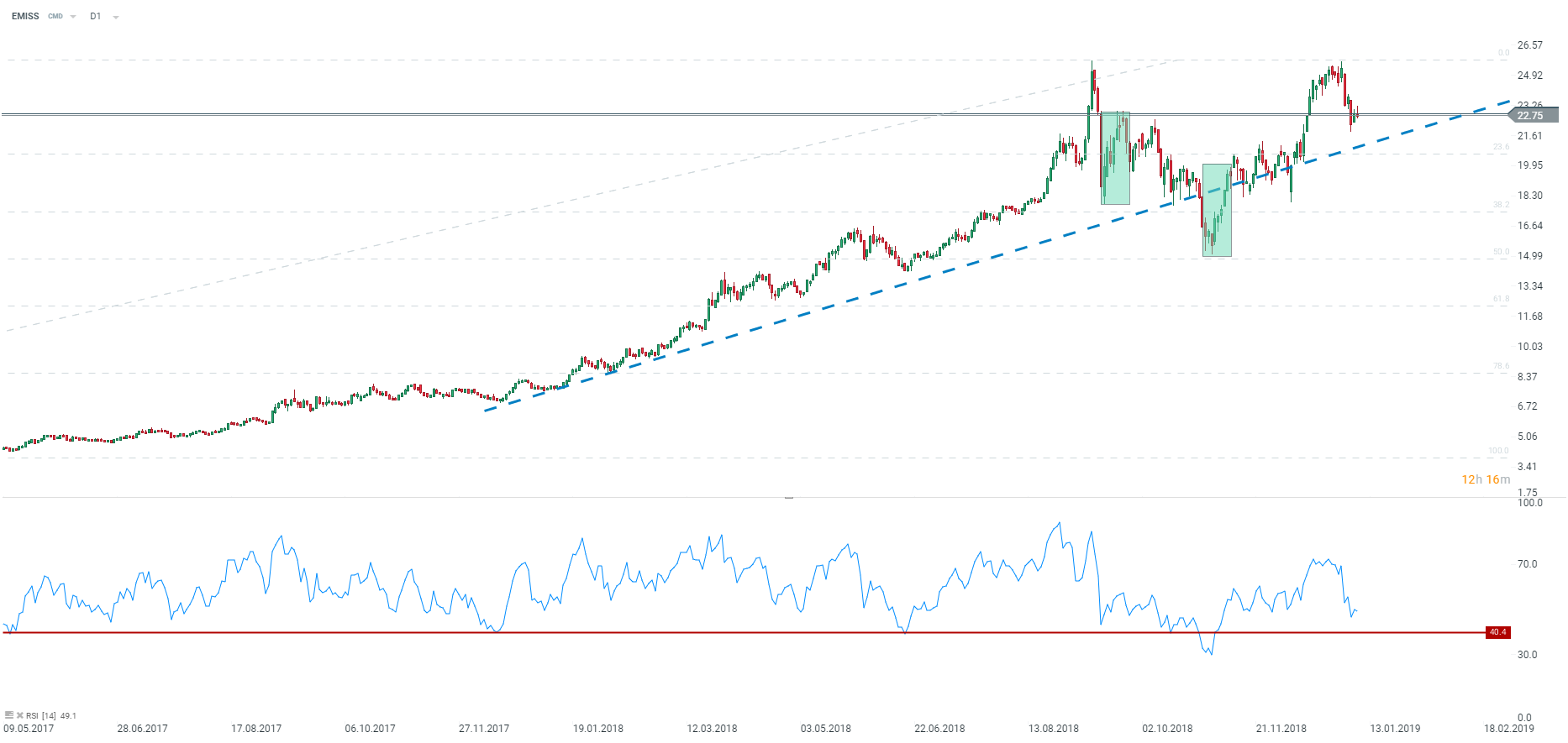 Ceny emisních povolenek v poslední době klesly, nicméně pokračování výrazných ztrát se nezdá pravděpodobné. Na druhou stranu je limitován také jejich růst. Někteří obchodníci se domnívají, že pokud budou nízké teploty v Evropě nadále převládat, tak by mohla cena povolenek vzrůst k úrovni 26 euro, zdroj: xStation5