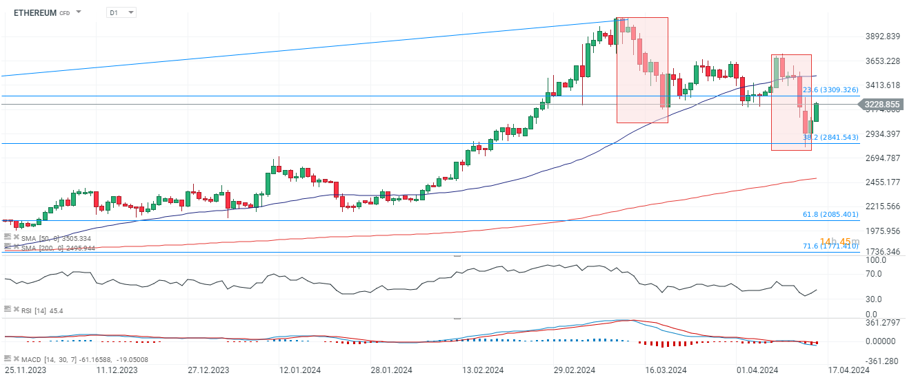 Druhá největší kryptoměna, Ethereum, zastavila pokles na úrovni 38,2 Fibo retracementu vzestupné vlny z podzimu 2022, což dále zdůrazňuje stále vyšší náchylnost samotného BTC k volatilitě. Ethereu se zatím podařilo vzrůst o zhruba 450 % z minim z června 2022, a to v době, kdy Bitcoin se stabilnějším růstem zaznamenal podobný vzestup z minim z podzimu 2022. Historicky se však ETH dařilo lépe než Bitcoinu až po halvingu naplánovaném na 20. dubna, přičemž dolar a jiná situace v likviditě než v cyklu 2020 - 2021 zatím vytváří další tlak na zájem o altcoin. Hlavní rezistencí je nyní průměr SMA50, který se nachází kolem 3500 dolarů za token