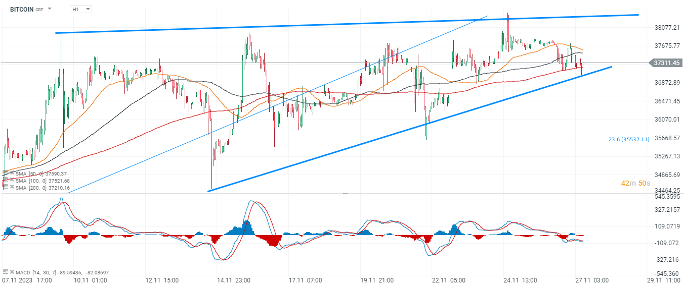 BITCOIN téměř horizontální linie odporu poblíž 37 700 - 38 500 USD s vzestupnou úrovní podpory (stále nižší minima) naznačuje formaci vzestupného trojúhelníku, z níž obvykle dochází k proražení ceny směrem vzhůru. Na druhou stranu rychlé vytlačení BTC po rally nad 38 000 USD (úroveň, jejíž překonání podle mnoha analytiků naznačovalo růst směrem ke 40 000 USD) může naznačovat "falešný průraz" a naznačovat pomalý obrat sil ve prospěch prodejců. Zdroj: xStation5