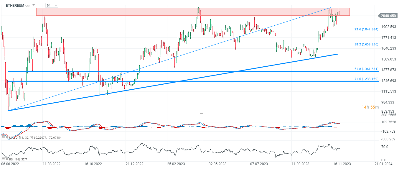 Při pohledu na ETHEREUM vidíme potenciálně klesající dvojitý vrchol na úrovni 2200 USD. V pátek cena již potřetí v tomto roce reagovala dynamickým poklesem z úrovní, které byly v první polovině roku rovněž negovány. Klíčovou úrovní podpory, kterou je třeba sledovat, zůstává 1850 USD. Zároveň je respektována dlouhodobá trendová linie, a to od léta 2022. Rychlý návrat nad 2100 dolarů by mohl naznačit silnější nákupní aktivitu a vyzdvihnout ETH na nová lokální maxima. Zdroj: xStation5