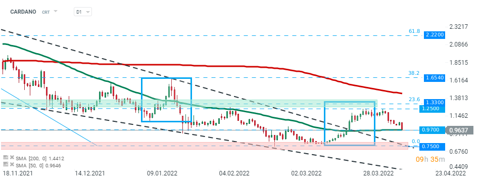 Cena Cardana minulý týden prudce klesla po neúspěšném pokusu o prolomení hlavní rezistnce na 1,25 dolarech a v současné době testuje místní support na 0,97 USD, která je označena předchozími cenovými reakcemi a 50 SMA (zelená čára). Zdroj: xStation5