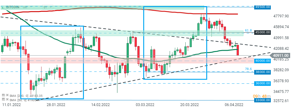 Bitcoin ve středu klesl pod klíčovou horizontální support zónu na 45 000 USD a aktuálně se blíží psychologické úrovni na 40 000 USD. Pokud bude korekce pokračovat, další hlavní sledovaný support leží na 38 000 USD, což je poznamenáno předchozími cenovými reakcemi a 78,6% Fibonacciho retracementem. Zdroj: xStation5