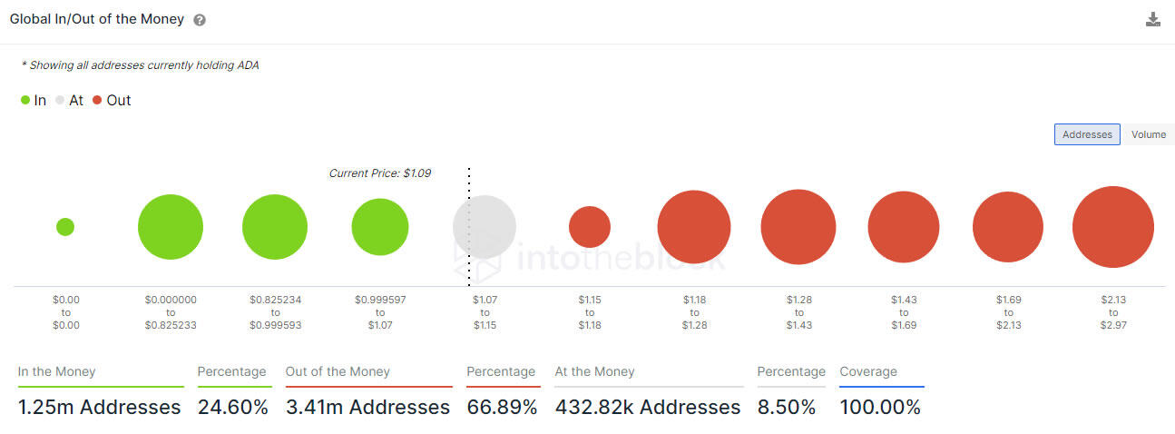 Přibližně 3,41 milionu adres ADA je v červených číslech ve srovnání s pouhými 1,25 miliony v zelených číslech. Zdroj: IntoTheBlock