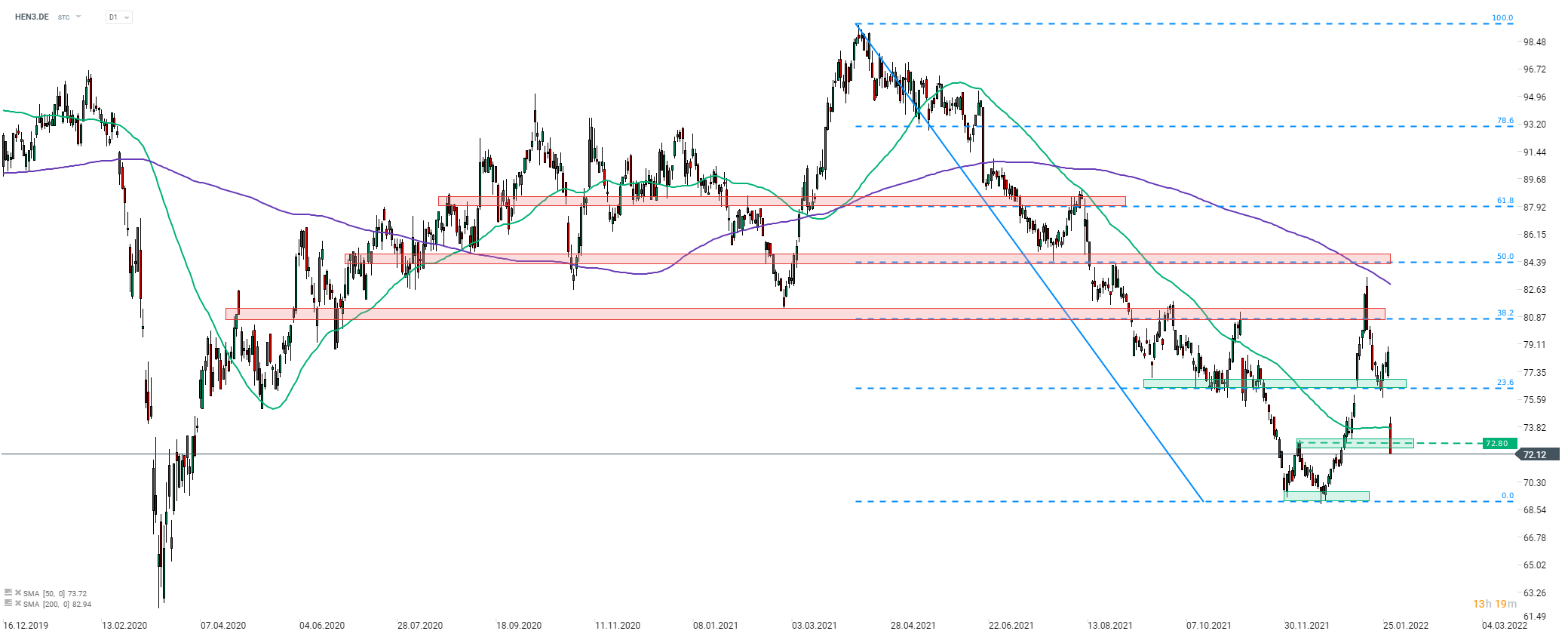 Akcie společnosti Henkel (HEN3.DE) dnes po zveřejnění výsledků propadly. Akcie se dostala až pod zónu supportu definovaného úrovní 23,6 % retracementu poklesu z minulého roku a nyní testuje krátkodobou swingovou úroveň na €72,80. Pokud se býkům nepodaří zastavit poklesy, tak se můžeme dočkat dalšího snížení k posledním minimům v oblasti €70,00. Zdroj: xStation5