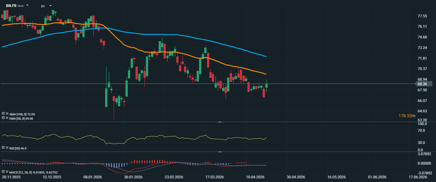 Akcie společnosti Danone se obchodují kolem 68,36 EUR a nadále zůstávají pod důležitými klouzavými průměry, konkrétně pod EMA 50 na 69,66 EUR i pod SMA 100 na 72,05 EUR. To potvrzuje, že titul je stále v krátkodobě až střednědobě slabším technickém nastavení. Po předchozím poklesu se sice cena snaží stabilizovat poblíž hladiny 68 EUR, zatím však chybí výraznější impulz, který by potvrdil obrat trendu směrem vzhůru. Z technického pohledu bude důležité sledovat, zda se akcie dokážou vrátit nad 69,66 EUR, což by otevřelo prostor k testu pásma kolem 72 EUR. Naopak při dalším oslabení zůstává nejbližší podporou oblast kolem 67 EUR, případně níže u 64,6 EUR.