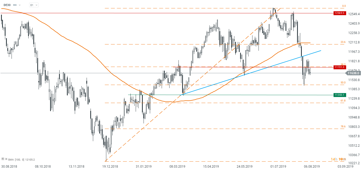 DE30 nedokázal prekonať dôležitý odpor umiestnený na úrovni 11 730 bodov. Kvôli tomu môže cena v najbližšom období smerovať na juh v dôsledku nepriaznivého sentimentu k riziku, ktorý sa prejavuje v iných regiónoch sveta. Prvú významnejšiu podporu možno nájsť na úrovni 11 300 bodov. Zdroj: xStation5