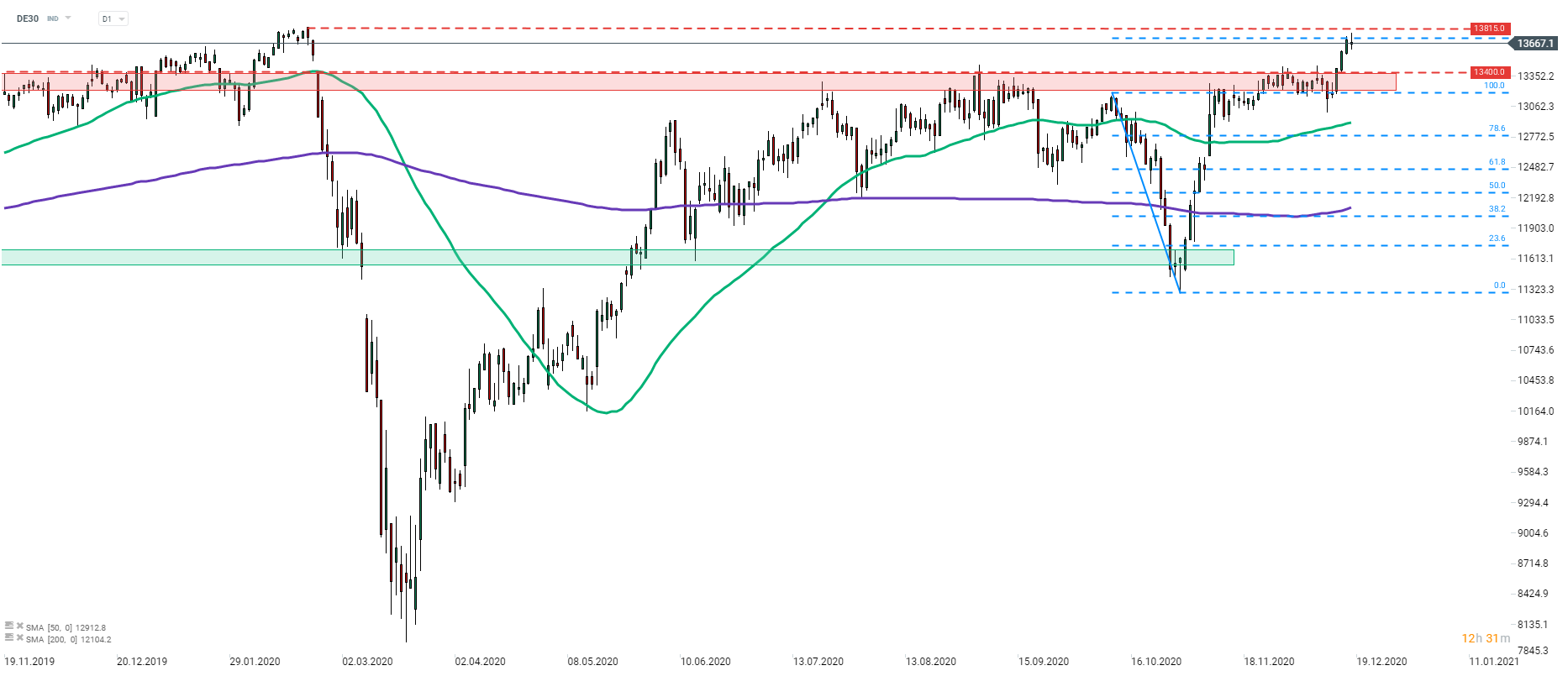 DE30 zaznamenal na začiatku dnešného obchodovania nárast a dostal sa na nové intradenné postpandemické maximum na úrovni okolo 13 760 bodov. 127,2% Fibo úroveň, ktorá sa v tejto oblasti nachádza, pôsobila ako odpor a index klesol pod hladinu 13 700 bodov. DE30 napriek tomu pokračuje v obchodovaní v údernej vzdialenosti od historického maxima 13 815 bodov. Očakáva sa, že americká snemovňa bude hlasovať o stimulačnom návrhu zákona ešte dnes a pozitívny výsledok hlasovania môže poskytnúť ďalšie palivo pre býkov na akciových trhoch.