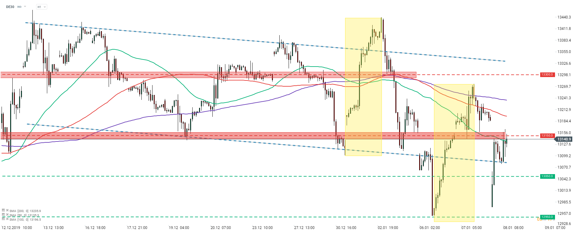 DE30 dnes otvoril s obrovským cenovým gapom o 1,6% nižšie, keďže investori boli zastrašení iránskym útokom na americké ciele v Iraku. Odvtedy sa však index zvýšil o približne 150 bodov a oproti včerajšej záverečnej cene sa obchoduje o 0,45% nižšie. Cenová akcia v dopoludňajších hodinách ukazuje, že kľúčovú prekážkou, ktorú dnes treba sledovať, bude predstavovať zóna odporu v rozmedzí okolo úrovne 13150 bodov. Dlhé, vrchné knoty predchádzajúcich hodinových sviečok naznačujú, že v blízkosti zóny sa objavujú medvede. Najbližšiu podporu, ktorú treba sledovať, predstavuje dolná hranica zostupného kanála (v súčasnosti na úrovni 13085 bodov).