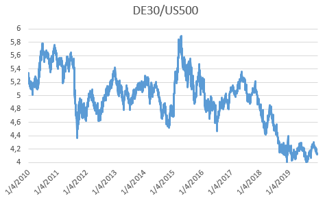 Opět jsme svědky slabého výkonu německého indexu ve srovnání s děním na Wall Steet, kde se indexy nevzdávají útoků na historická maxima. Pokud porovnáme vzájemnou výkonnost indexů DE30 a US500, tak se opět dostáváme k nejnižším úrovním za poslední dekádu, a to přestože DAX zahrnuje výplatu dividend a index S&P 500 nikoliv. Musíme však být opatrní v očekávání toho, že se německý index brzy "chytí" a začne Wall Street rychle dohánět. K dosažení tohoto scénáře bychom nejdříve museli vidět lepšící se ekonomickou situaci v Evropě (zatím se německá výroba drží v recesi). Nízká úroveň DE30/US500 se zdá více důsledkem dobré výkonnosti technologického sektoru v USA v posledních letech.