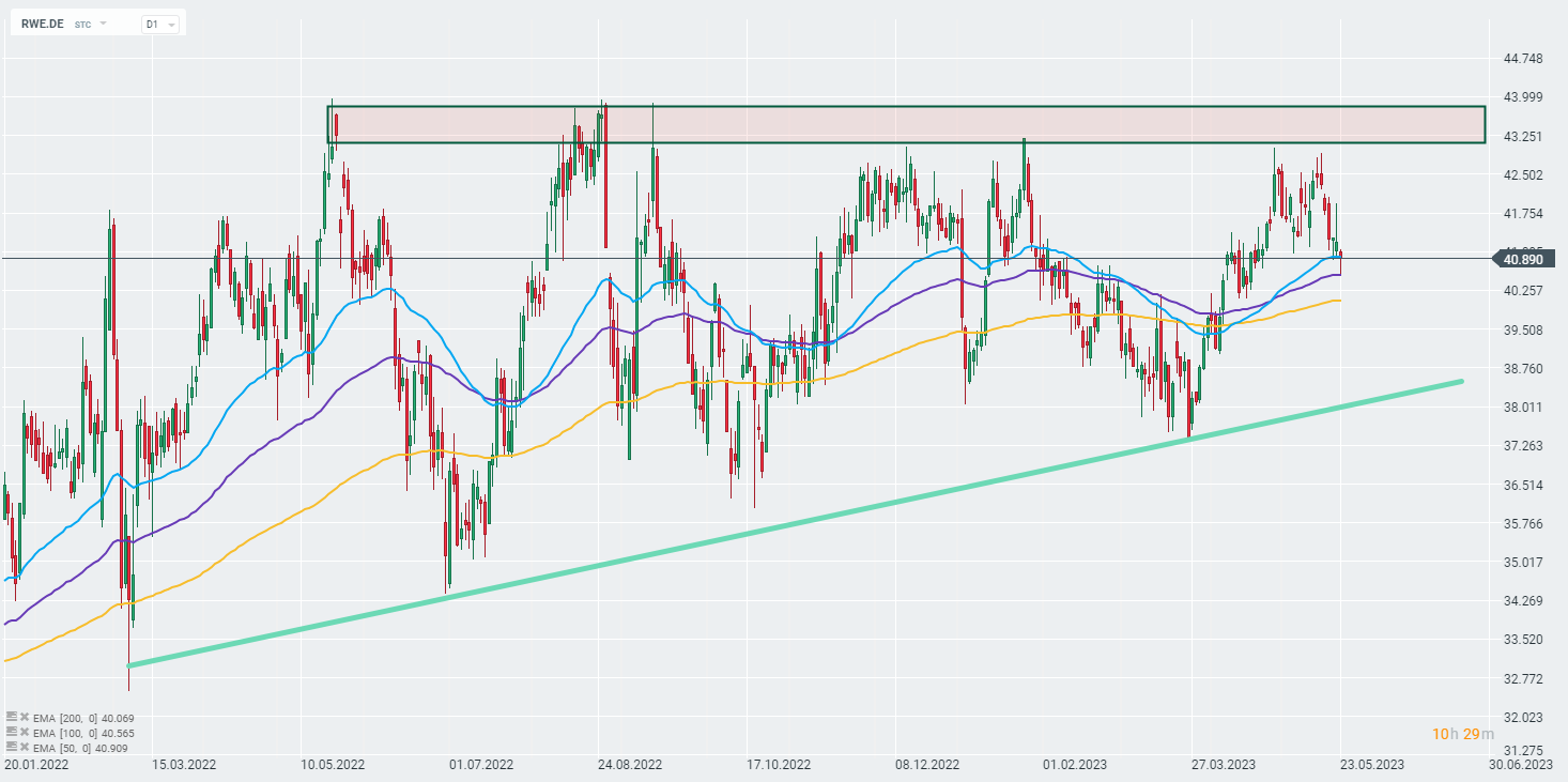 Akcie RWE (RWE.DE) počas dnešnej seansy mierne klesli a testujú podporu na sútoku 50-dňových a 100-dňových exponenciálnych kĺzavých priemerov. Zdroj: xStation 5