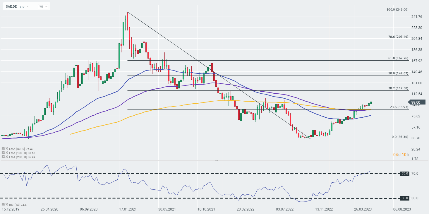 Akcie Shop Apotheke (SAE.DE) predlžujú vzostupnú vlnu spustenú v októbri 2022. Dnes akcie získavajú takmer 2 %. Zdroj: xStation 5