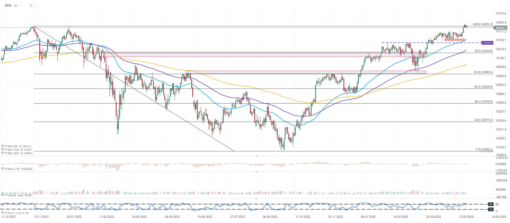 Futures založené na nemeckom indexe DAX (DE30) sa dnes obchodujú smerom nadol a opúšťajú nedávno prekonané historické maximá. Zdroj: xStation 5