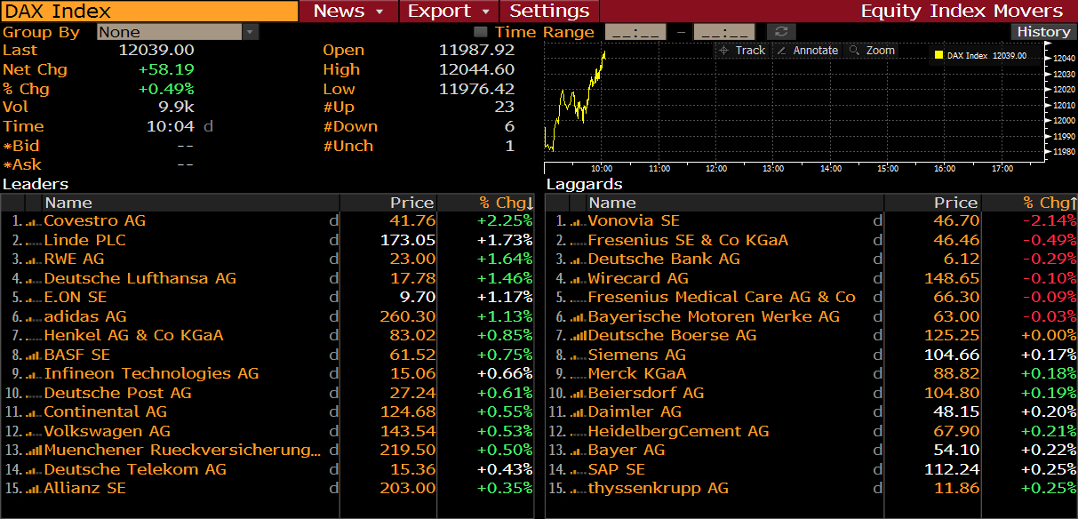 DE30 roste o půl procenta. Akcie Convestro rostou nejvíce, zatímco pod největším tlakem je Vonovia. Zdroj: Bloomberg