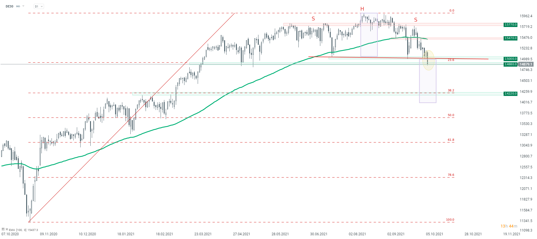 Pohľad na DE30 nám ukazuje, že index sa obchoduje na najnižšej úrovni od polovice mája 2021. Nemecký index sa dnes prelomil pod výstrihom vzoru hlava a ramená, čo vytvára riziko ešte väčšieho poklesu. Index by teoreticky mohol klesnúť až na 14 000 bodov!