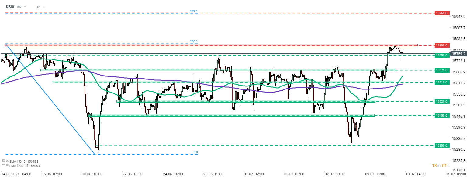 DE30 si prošel včera odpoledne rally a otestoval úroveň historického maxima na 15 800 bodech. Německému indexu se však nepodařilo dosáhnout na vyšší úrovně a dnes jsme svědky mírné korekce. Krátkodobý support se nachází na 15 750 bodech a dosud se mu dařilo další ztráty eliminovat. Zmíněná úroveň 15 800 bodů slouží jako krátkodobá rezistence. V případě průrazu se dočkáme historického maxima. Nejbližší další rezistence leží na 15 960 bodech. Je definována úrovní 127,2 % retracementu korekce z druhé poloviny června. Potenciální cíl poslední formace dvojitého dna se nachází ještě o přibližně 100 bodů výše.