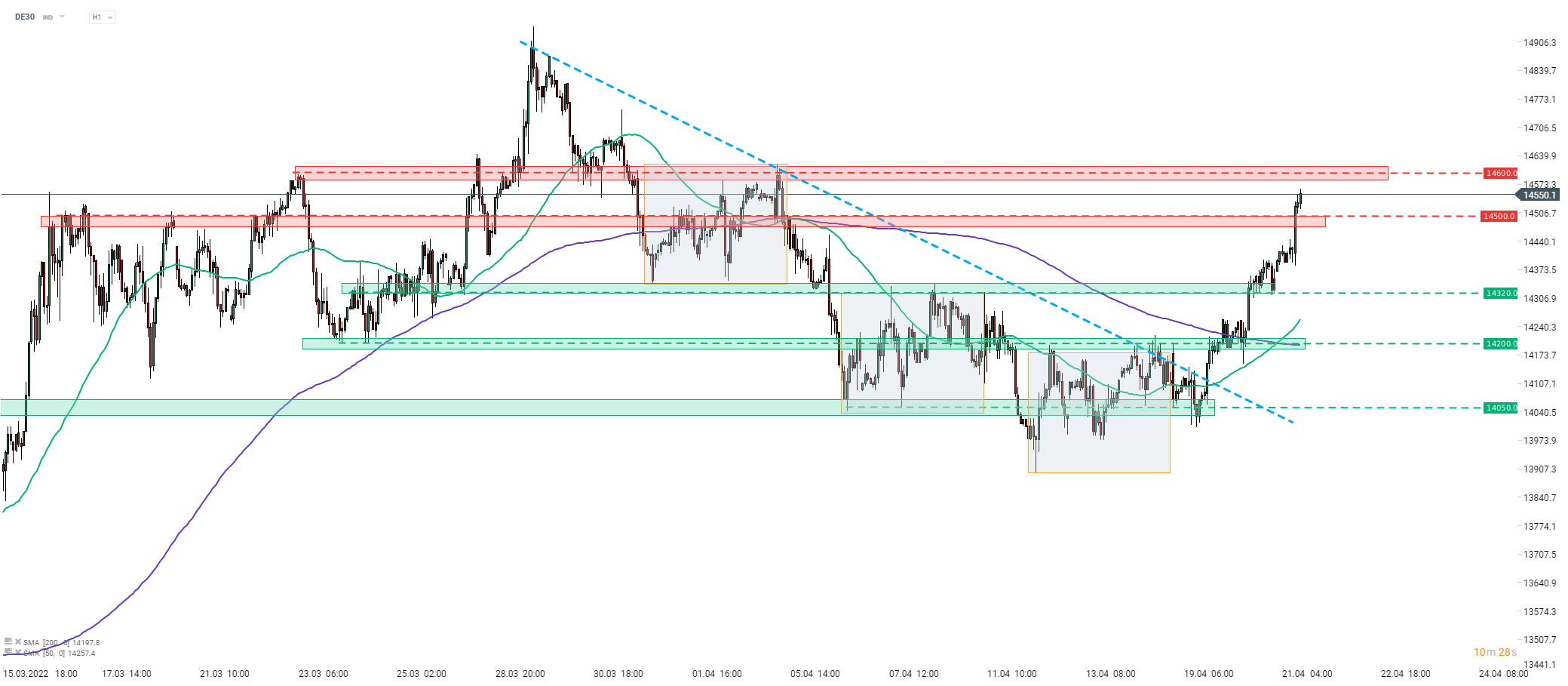 DE30 pokračuje v oživení zahájeném po prolomení sestupné trendové linie a horní hranice geometrie trhu. Index se obchoduje téměř o 5 % nad minimem z 12. dubna 2022. DE30 se dnes podařilo prolomit nad swingovou úrovni 14 500 bodů a obchoduje se na nejvyšší úrovni od 5. dubna 2022. Klíčovou krátkodobou rezistenci ke sledování lze nalézt v oblast 14 600 bodů a je označena předchozí cenovou reakcí. V případě, že býci jí neprolomí, nelze vyloučit stažení směrem ke dvěma nejbližším support zónám - 14 500 a 14 320 bodů.