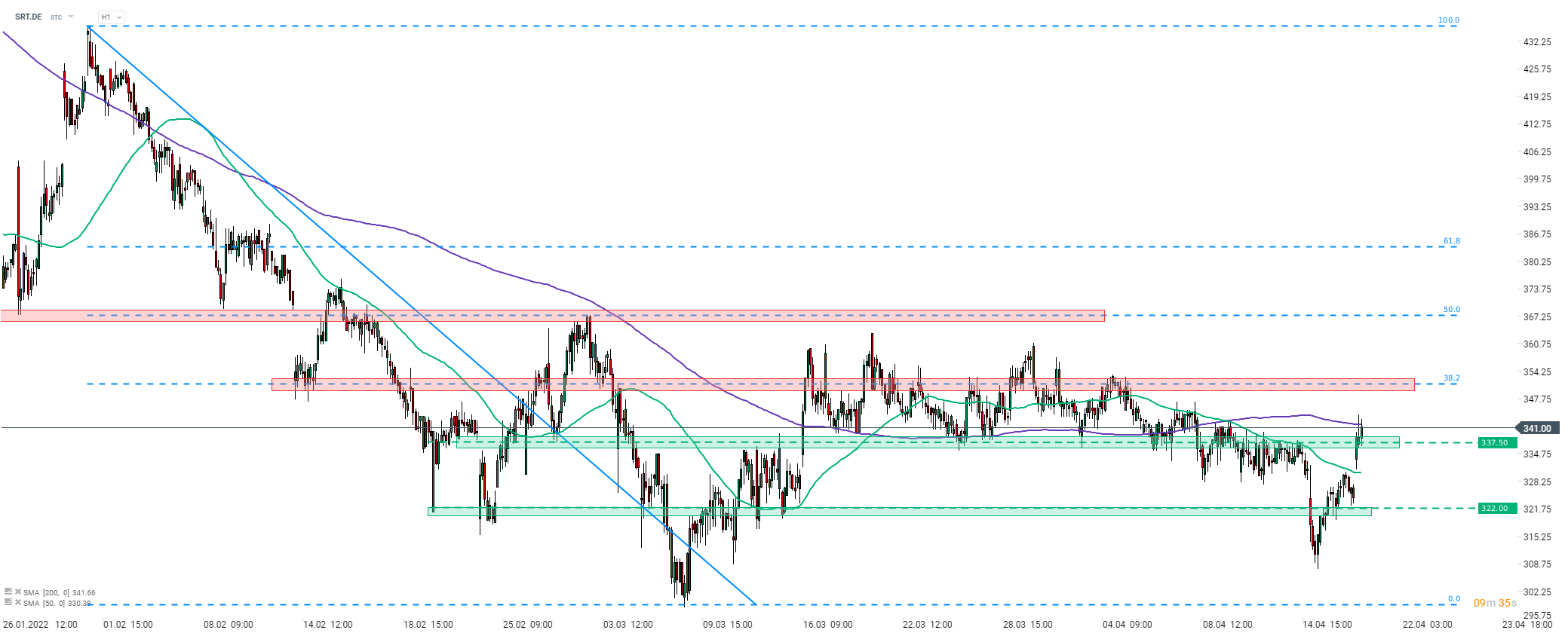 Sartorius (SRT.DE) dnes rostl po zveřejnění solidních zisků za 1. čtvrtletí. Akcie vyskočily nad krátkodobou swingovou úroveň v oblasti 337,50 EUR. Pohyb nahoru byl však prozatím zastaven 200hodinovým klouzavým průměrem v oblasti 342,00 EUR (fialová čára). V případě, že se býkům podaří překonat tuto překážku, další rezistenci lze nalézt v rozsahu kolem 38,2% retracementu sestupného pohybu (oblast 351,00 EUR). Zdroj: xStation5